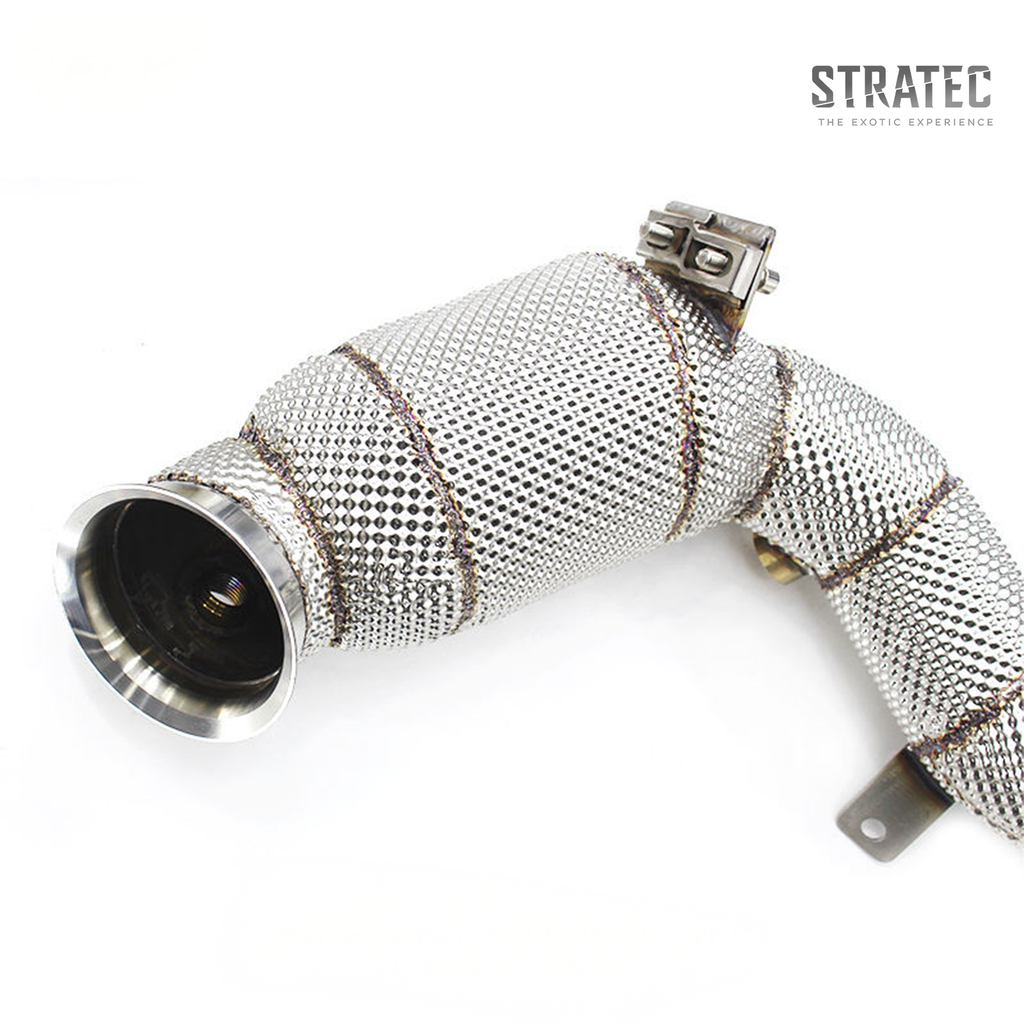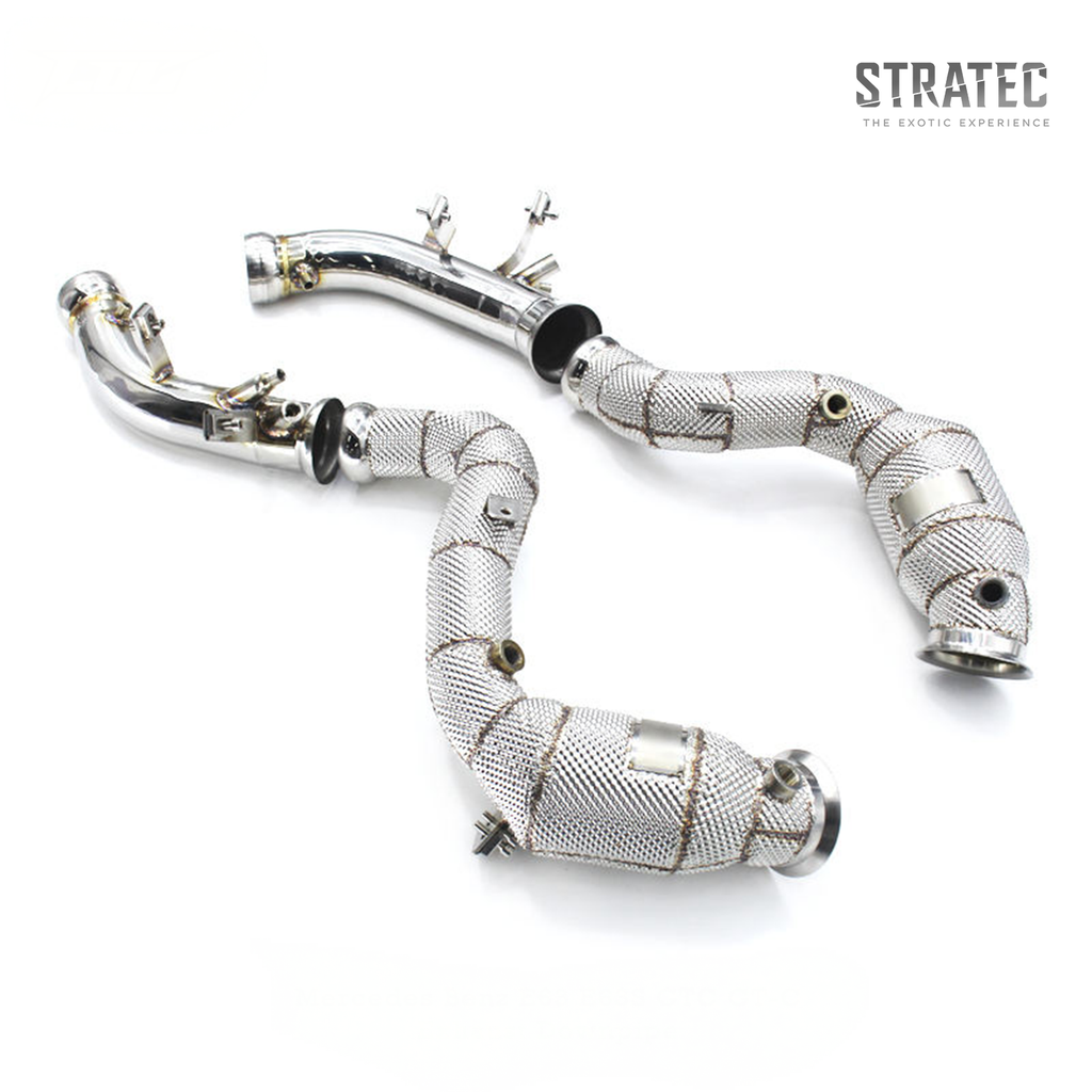 Unlock maximum performance from your 4.0L Twin‑Turbo AMG platform with the STRATEC Custom High‑Flow Catted Downpipe & Header System, available in 100‑cell, 200‑cell, or 300‑cell catalytic configurations to match your performance goals.
